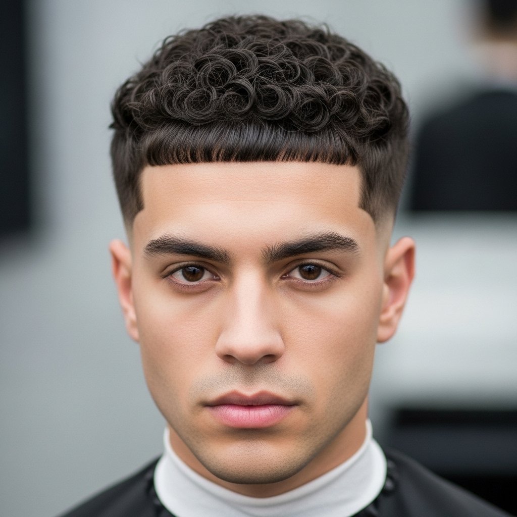 This version keeps the trademark straight fringe and fade while highlighting your natural curls, giving you a look that’s modern, fresh, and full of texture.